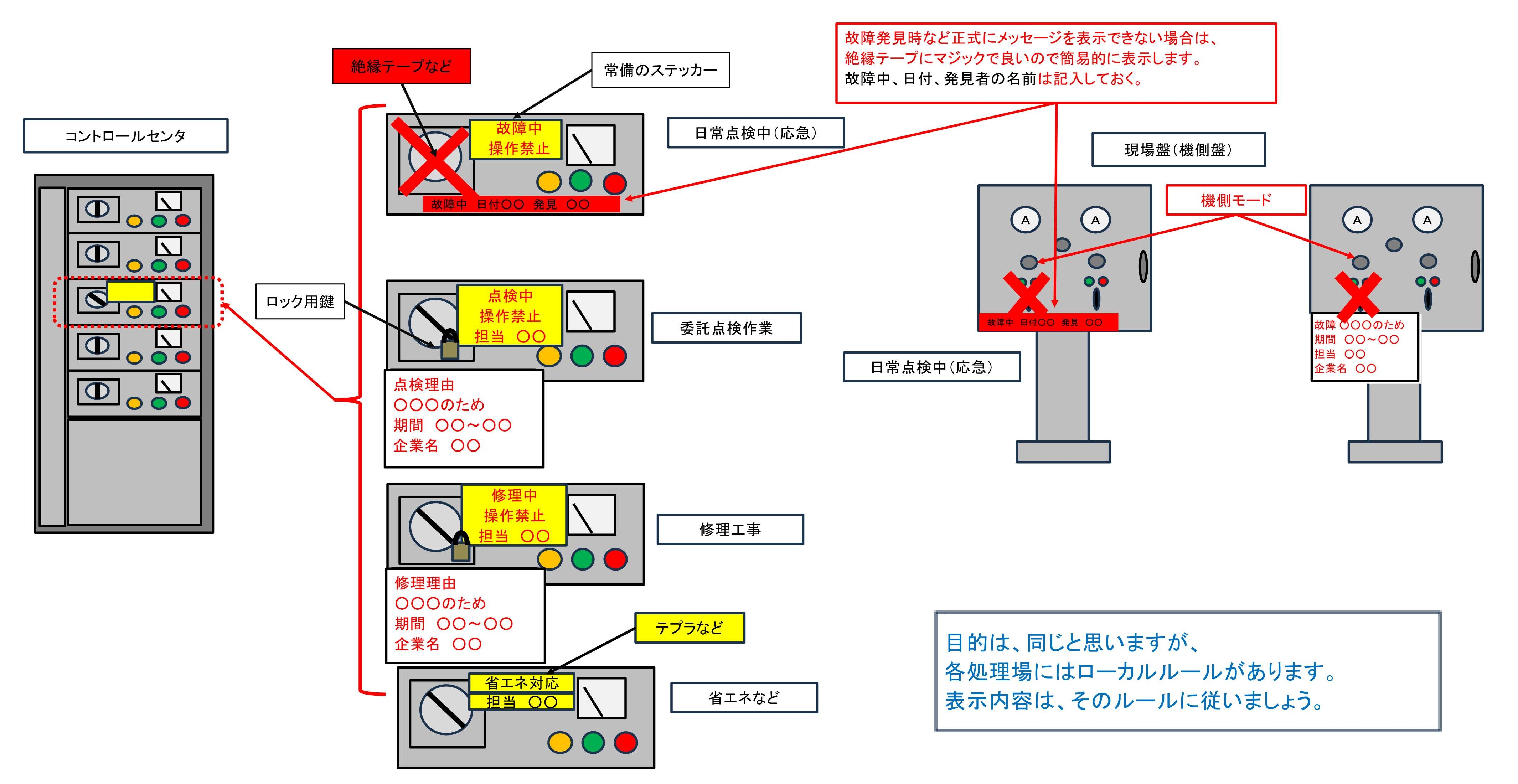 現場盤などでは「機側」モードにして絶縁テープなどで操作ができない旨、表示しておきます。