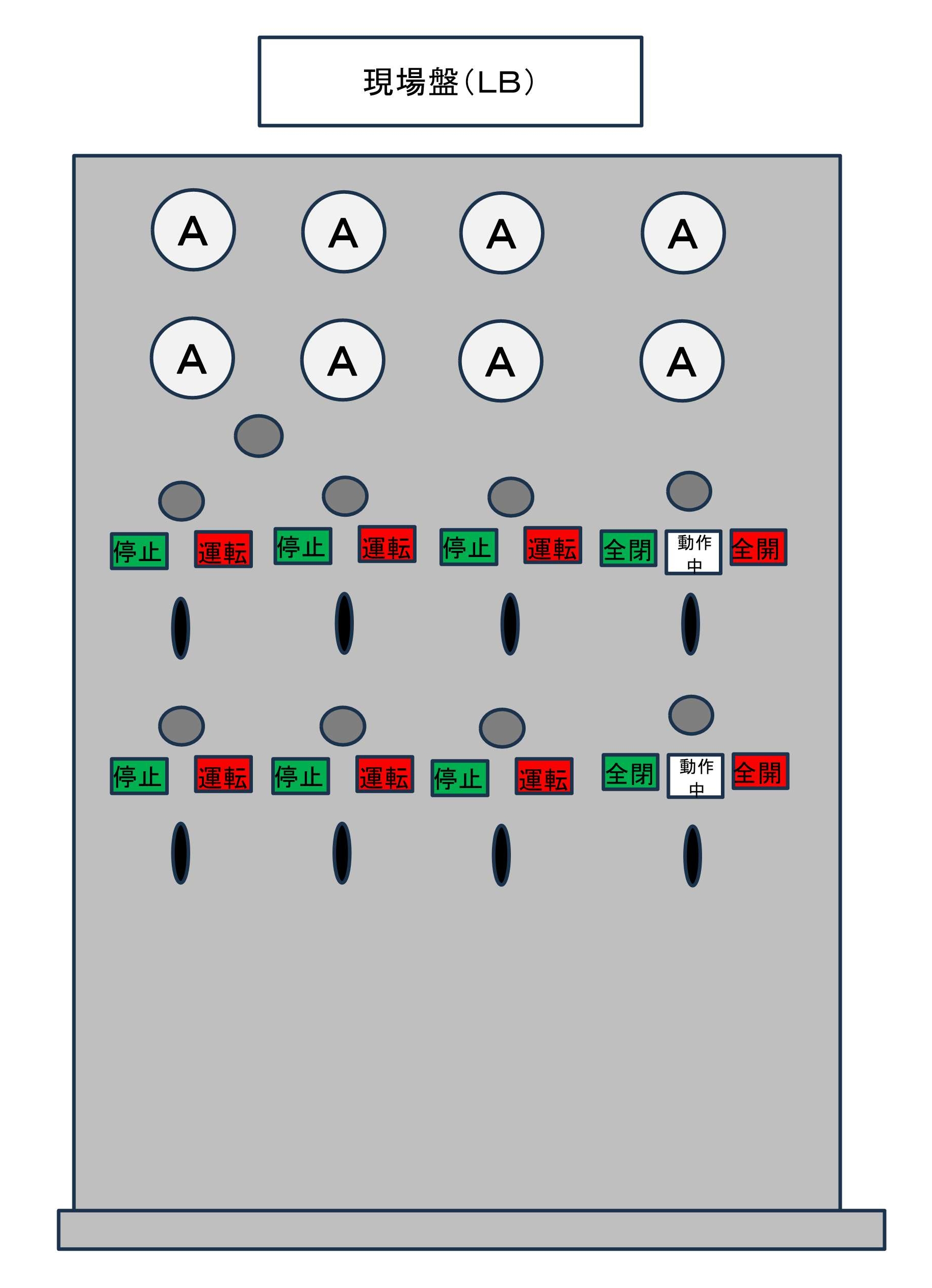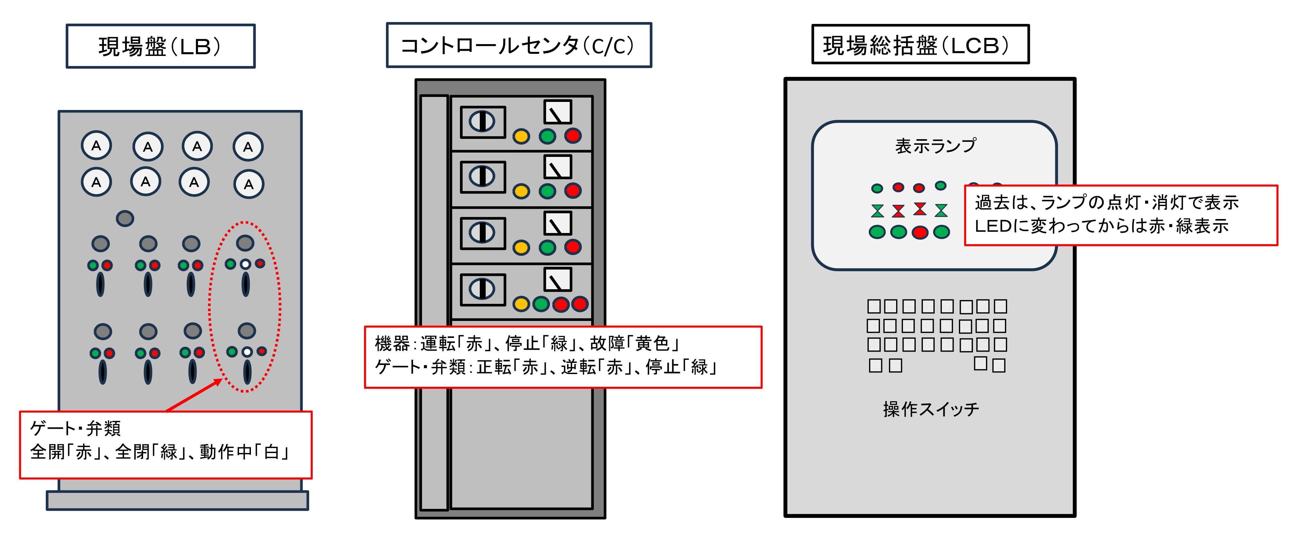 処理場の機械の現場盤等に表示されるランプの色についてです。通常、「赤」が運転「緑」が停止となります。