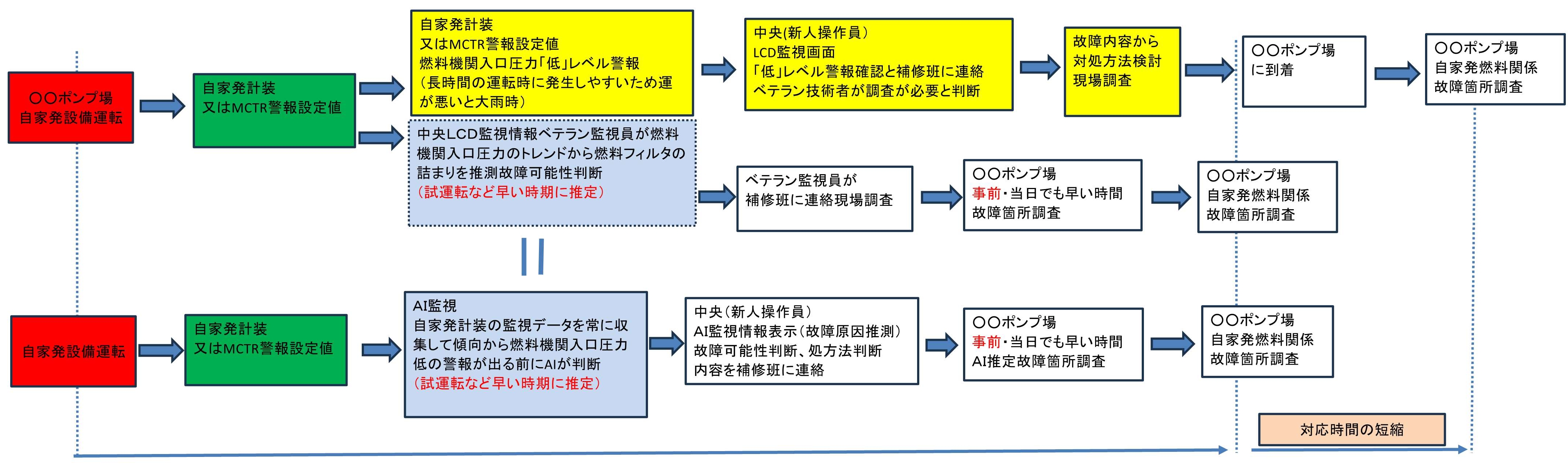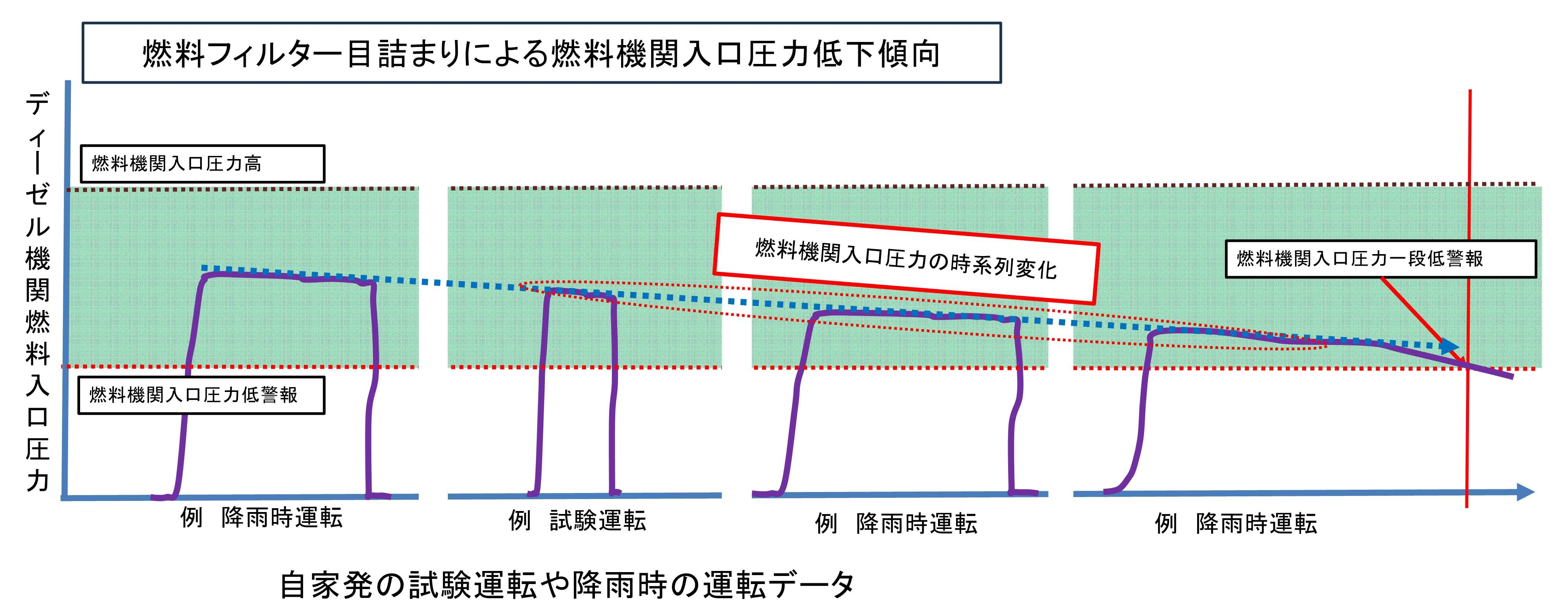 AI監視制御システムでは燃料機関入力圧力データの正常時のばらつきをモニタリングしながら、低下傾向を判断し、早めの調査(フィルター詰まりなのか、その他か)