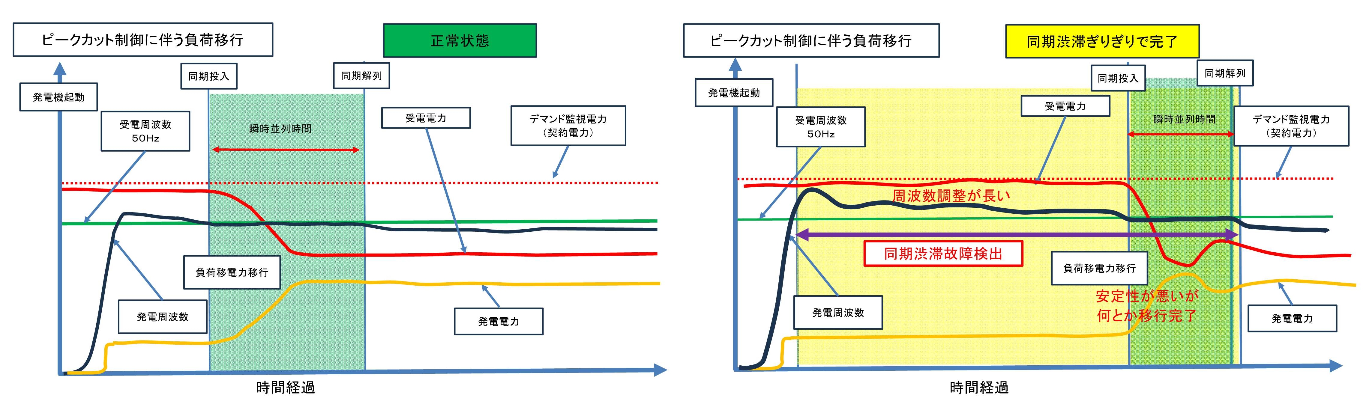 これにより、自家発のディーゼル機関、ガバナ制御装置などの不具合や同期装置の不具合を早期に調査・発見できるようになります。