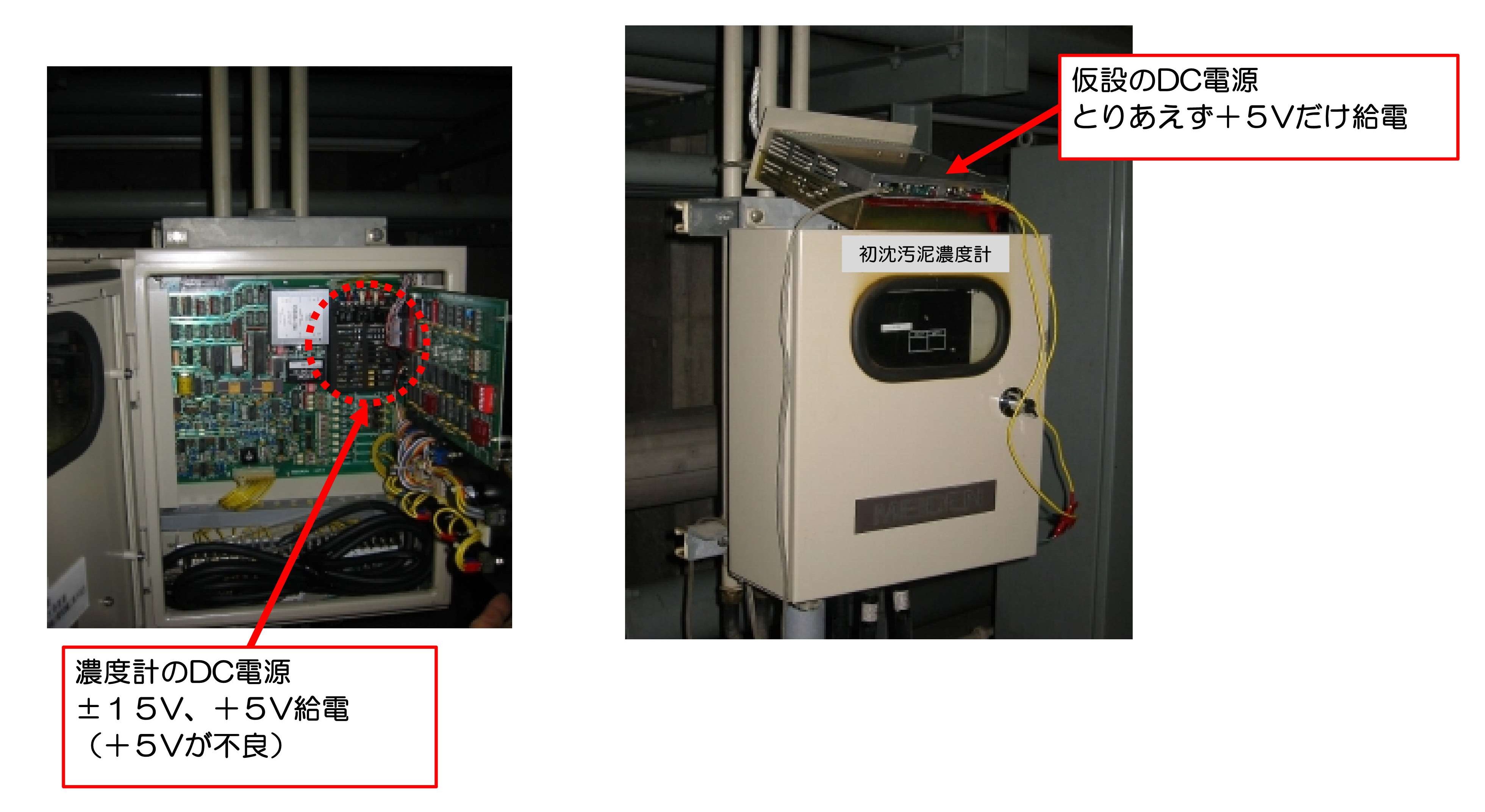 調査したところ、濃度計変換器の内部DC電源ユニットの+5V電圧が出力されていない事が分かりました。