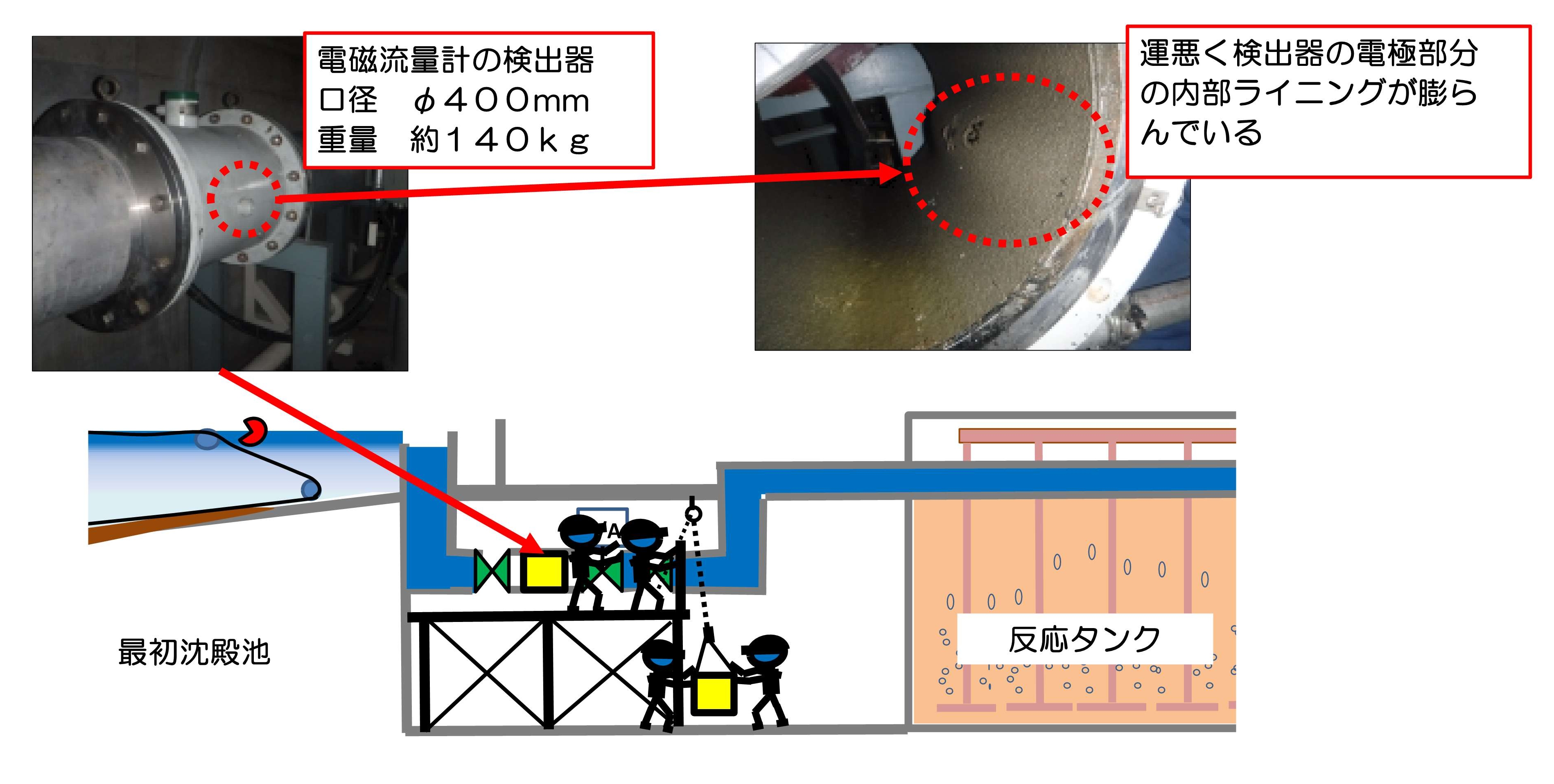 このため、大変ですが電磁流量計の検出器(φ400mm)の内部を調べることにします。