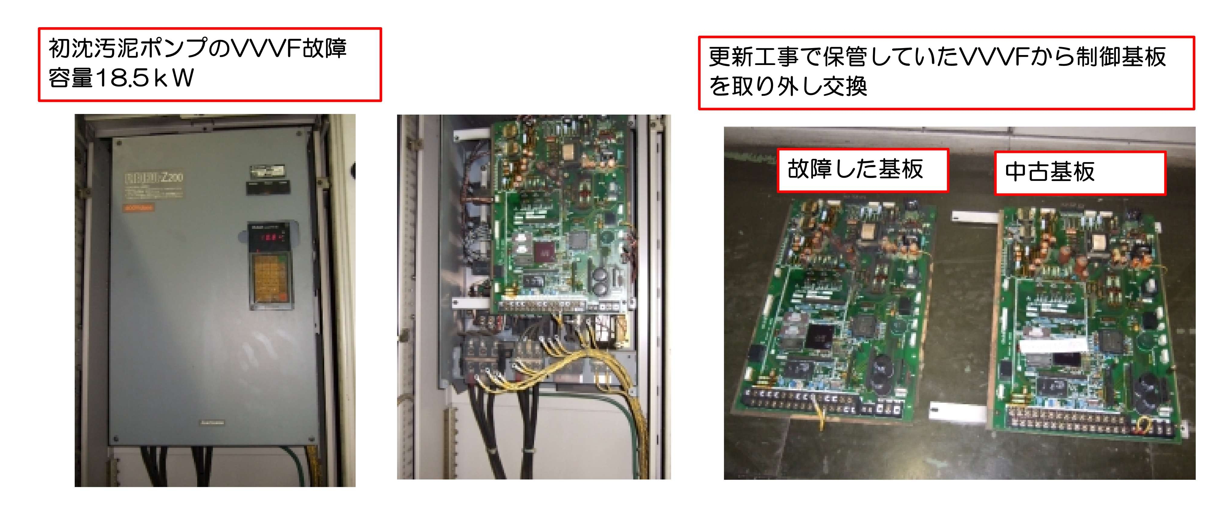 他に余剰汚泥ポンプ、返送汚泥ポンプ、雨水滞水池返送水ポンプなどなど、制御基板だけはなくユニットごとそっくり修理したものはかなりの数に上ります。